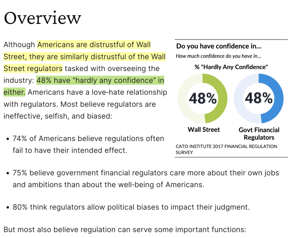 I think this 2017 survey from the Cato institute highlights that I am not alone in my distrust of the financial sector, and this was long before the current financial crisis, meaning these figures are likely substantially lower today.