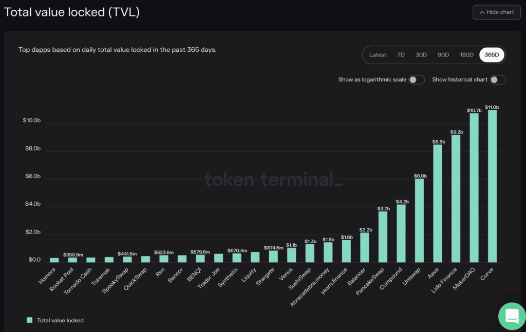 Image via TokenTerminalDeFi tokens remain an attractive investment during bear markets, as It’s not just the potential for capital appreciation of tokens that attracts users. I would be remiss if I didn’t mention the other benefits and use cases, basically, the whole point of DeFi in the first place. DeFi has the ability to facilitate lending and borrowing without the need for banks and provides ample opportunities to earn passive income thanks to processes like lending, yield farming, Liquidity Provisioning, Staking, etc. all of which can provide crypto users with income in both bull and bear markets.