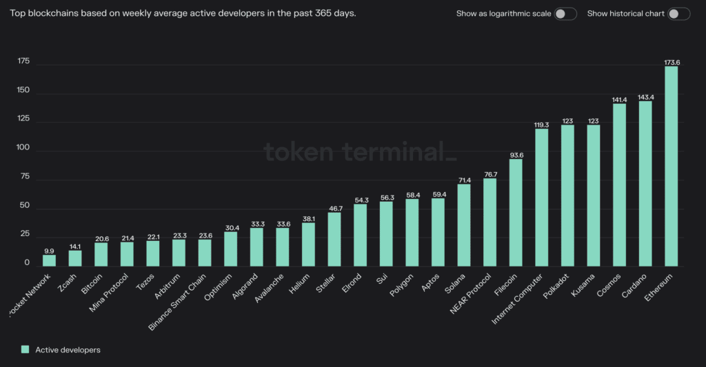 According to Token Terminal, Cosmos has the second most developer activity behind Ethereum, tied with Cardano. This shows that despite the bear market, Cosmos is a thriving ecosystem with plenty of innovation happening.