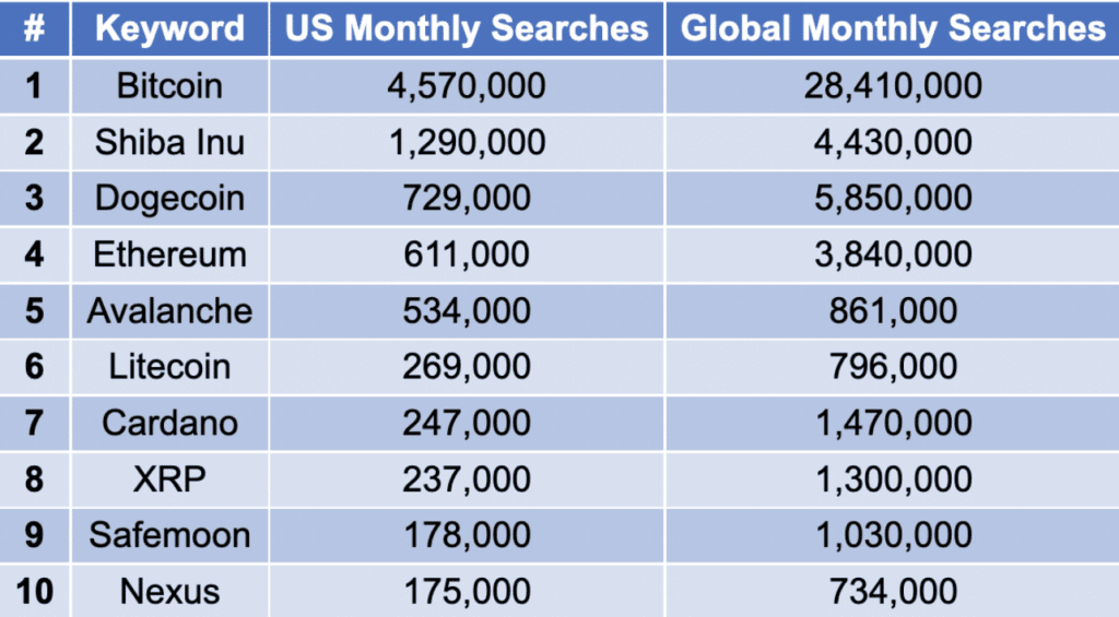 Top 10 cryptocurrencies based on U.S. and global monthly searches. Source: DollarGeekBitcoin is the digital asset that banks and institutions feel is safest and are diversifying into the most. In fact, the Bank of International Settlements recently announced that central banks can allocate a portion of their reserves to Bitcoin as early as 2025.