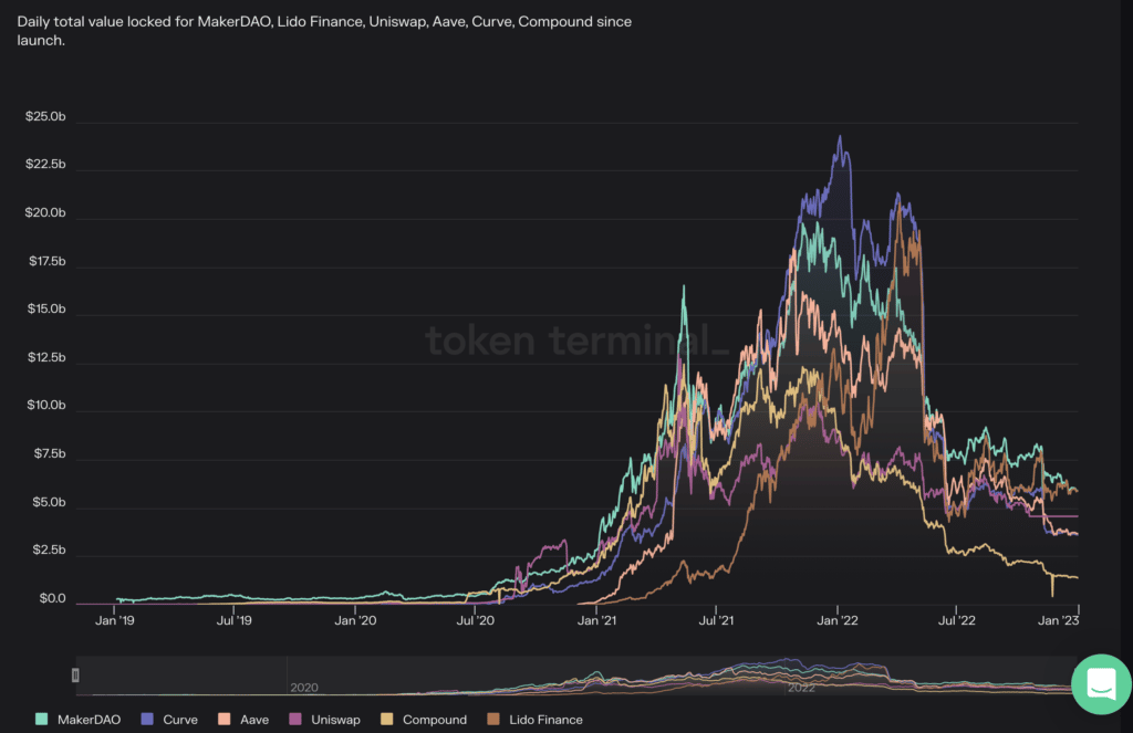 Search interest in “Decentralized Finance” has risen by 2,500% in 5 years and 14% since the collapse of FTX. Image via explodingtopics.comHere is an image showing just how much capital is tied up in some of the largest protocols, keeping in mind that this is even after a year-long bear market: