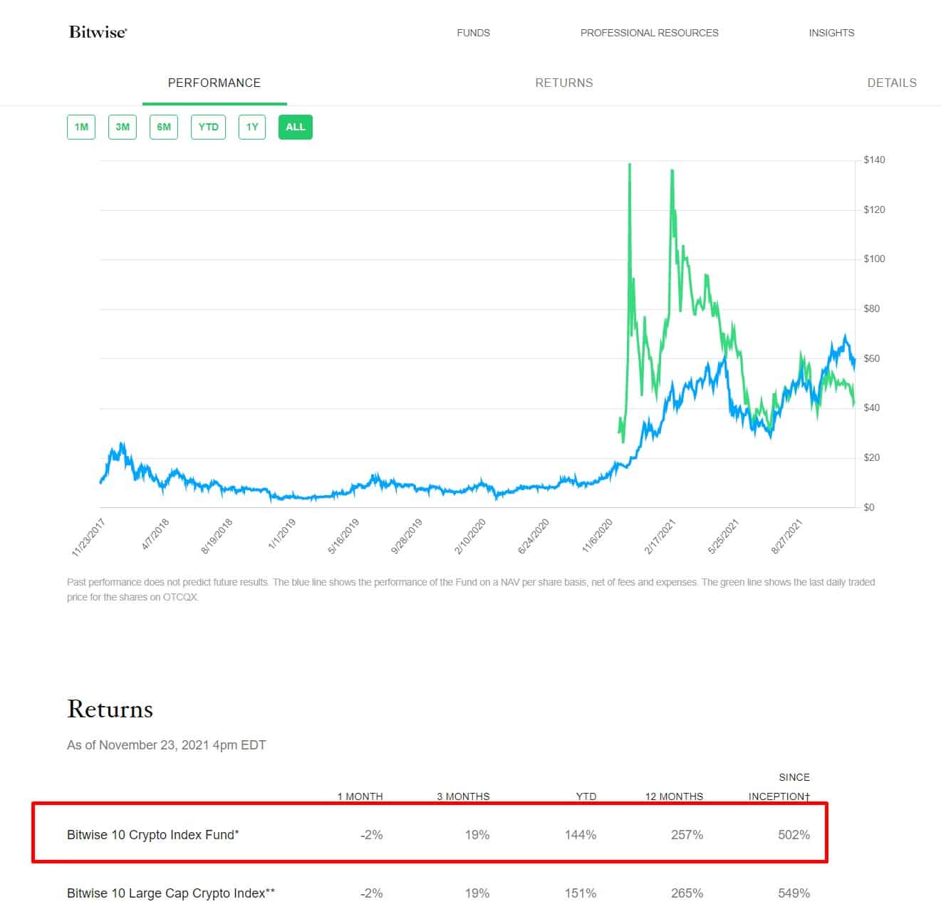 It is important to make the distinction that when we look at funds such as the Bitwise crypto top 10 index fund, or any other crypto index funds, the ROI’s can be drastically different as there are differently weighted holdings in different crypto assets. Bitwise has 60% of the total funds allocated to Bitcoin and 28% to Ethereum with a much smaller percentage allocated to other cryptos and still holds cryptocurrencies that have fallen out of the top ten long ago.