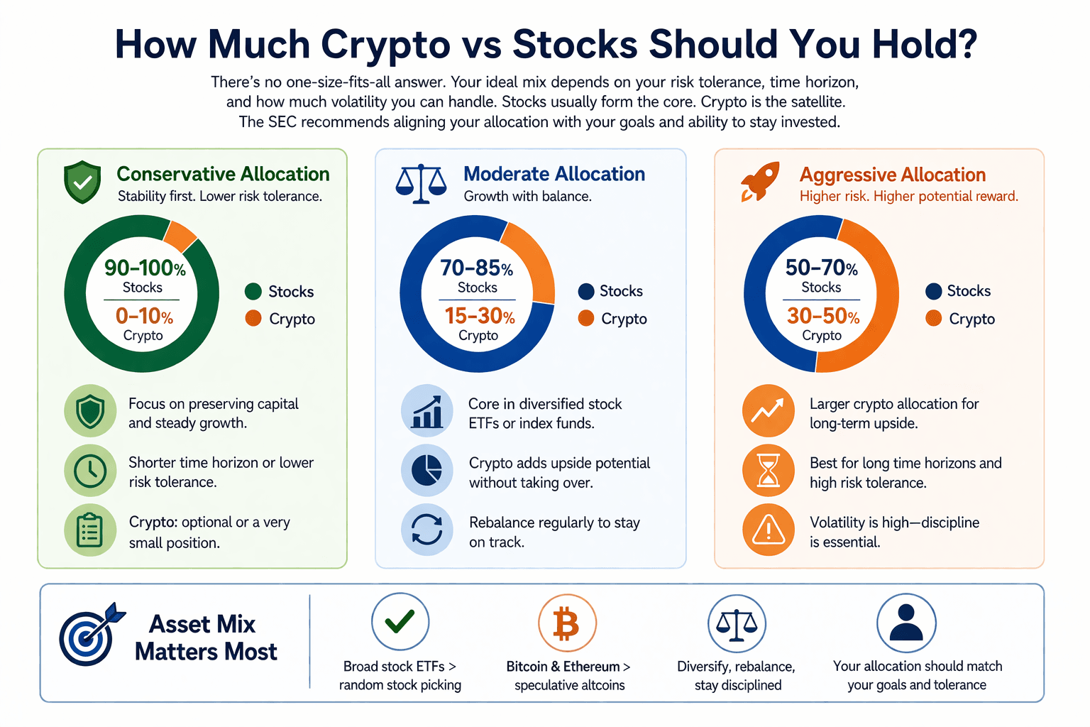 - Diversification and portfolio allocation: Both crypto and stocks make their case as a means to diversify an investment portfolio. Crypto’s eye-popping returns in a portfolio prove no match for stocks, however.