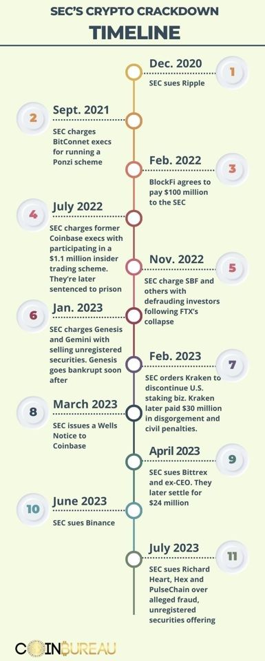 Crypto Has Been in the SEC's Crosshairs Lately. Infographic Created Using Public DisclosuresAs you can see, the SEC has been busy clamping down on crypto companies and individuals. In an April hearing before Congress, Gensler said: