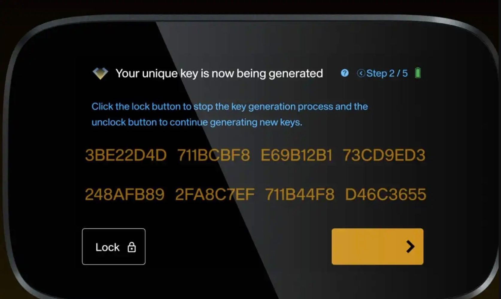 - Trustless Private Key Generation: The private key is created during initial device setup. Private keys are created using a combination of a user’s fingerprint, ambient lighting conditions, and the user can shuffle parts of the key.