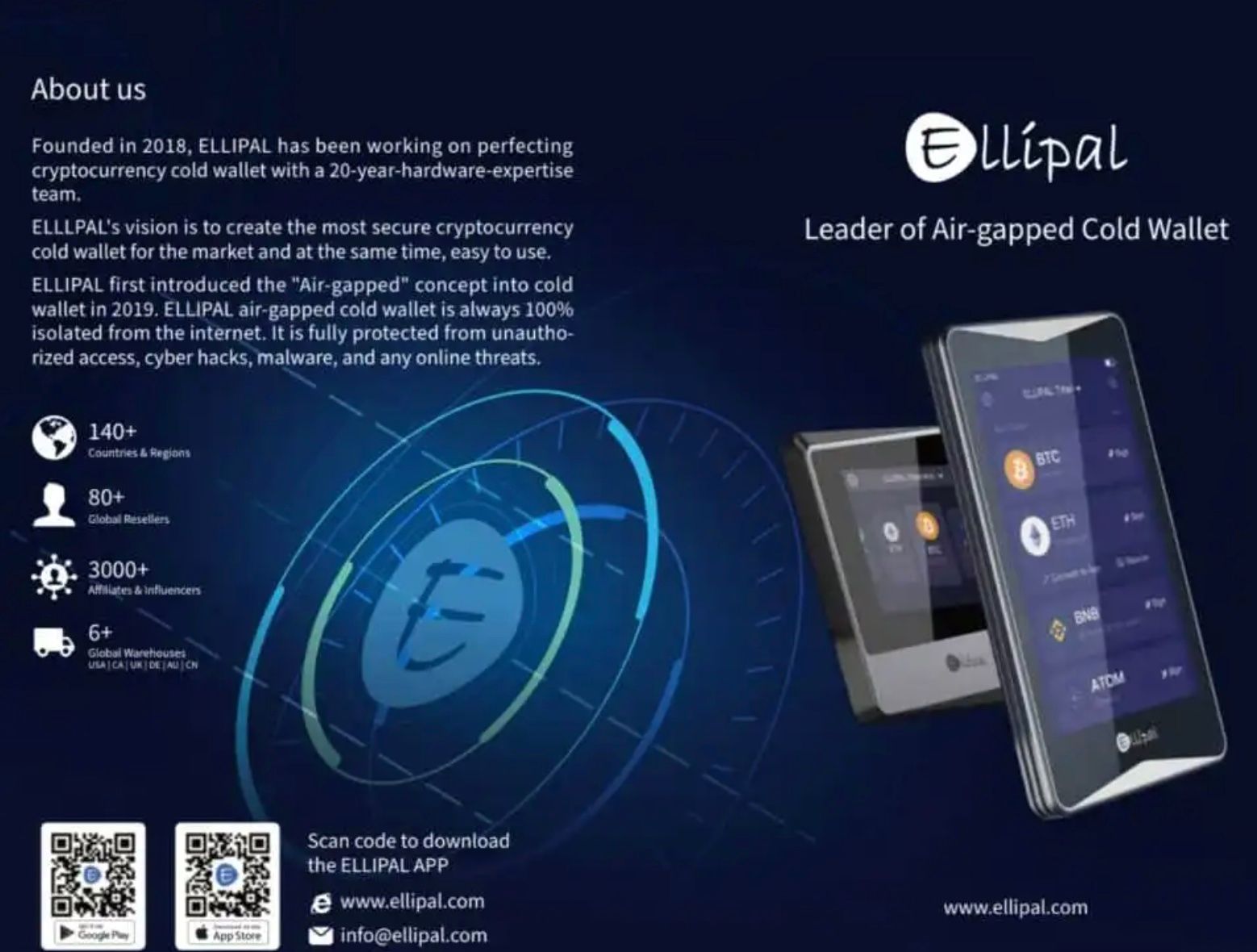 ELLIPAL, founded in 2018 in Hong Kong, is renowned for pioneering air-gapped hardware wallets. Their flagship ELLIPAL Wallet debuted in 2018, followed by the upgraded ELLIPAL Titan.