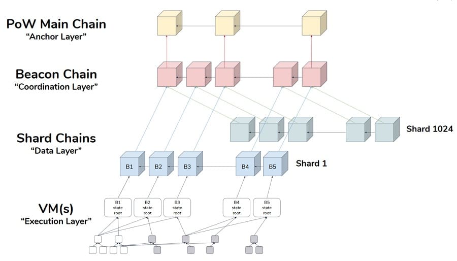 Ethereum 2.0 consists of an entirely new blockchain called the Beacon Chain. The Beacon Chain uses something called sharding to increase Ethereum’s performance. This essentially involves creating additional blockchains called shards that attach to the main chain (in this case, the Beacon Chain).