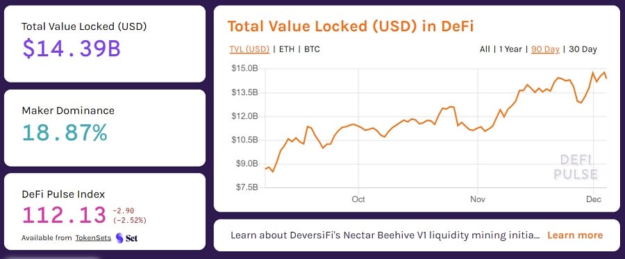 DeFi has seen significant growth in 2020. As it turns out, cutting out the middleman is quite lucrative. Annual interest rates in Ethereum DeFi protocols can be anywhere between 3-10 000%+ (though the extreme APYs are rare and short lived). This has attracted nearly 15 billion dollars of cryptocurrency to the DeFi space, which is growing by the day.