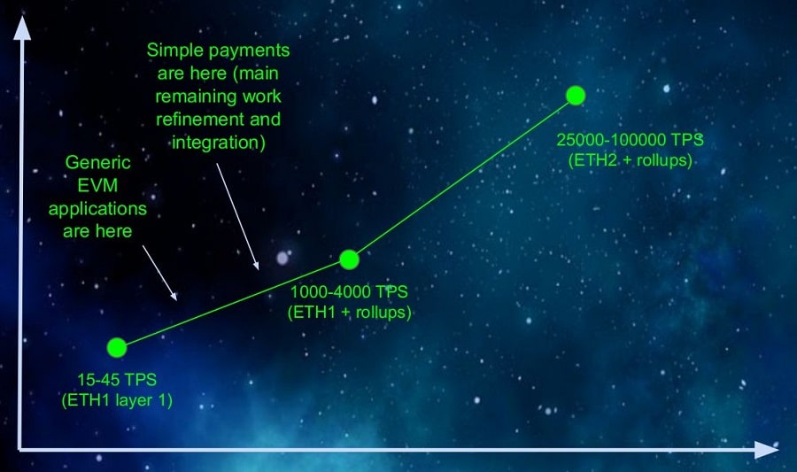 The timeline for Ethereum scaling as outlined by Vitalik Buterin. Most layer-2 scaling solutions basically involve processing some portion of transactions on a separate blockchain and then recording them on the Ethereum blockchain in a batch as a single transaction. These types of scaling solutions are referred to as rollups, zkrollups, or zksnarks.