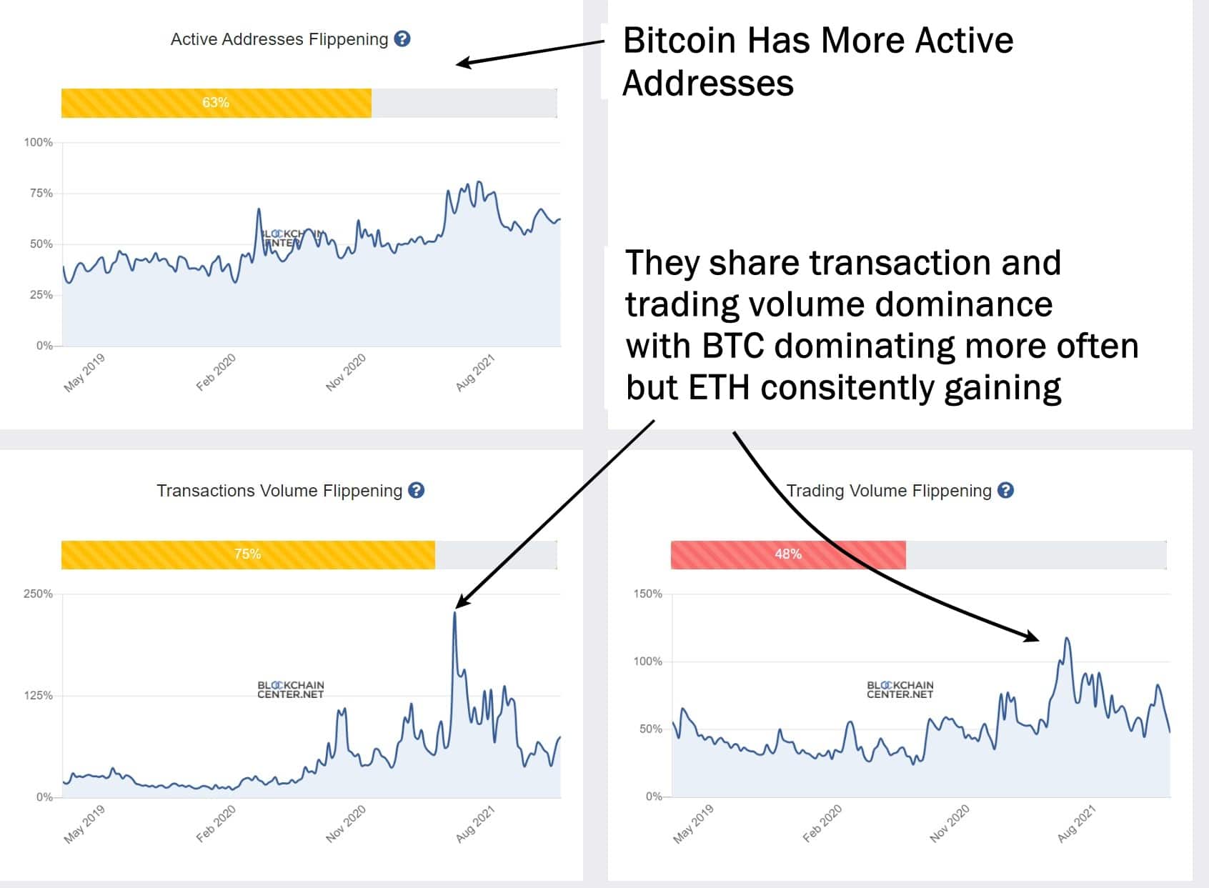 The Total Transaction Volume Happening on the ETH and BTC Networks Image via blockchaincenter.net Ethereum is also catching up on other metrics such as active addresses and aggregated trading volume on exchanges.