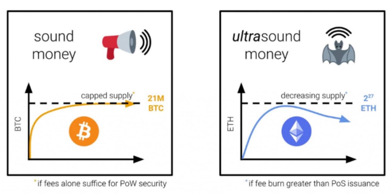 ETH being referred to as “Ultra-Sound,” money was a direct shot at Bitcoin, a boasting reference from Eth enthusiasts who feel that ETH is a better store of value and has a better monetary policy to Bitcoin. Where many would disagree with the “Ultra-Sound” claim is that Bitcoin is far more trusted, fortified and battle-tested than Ethereum.