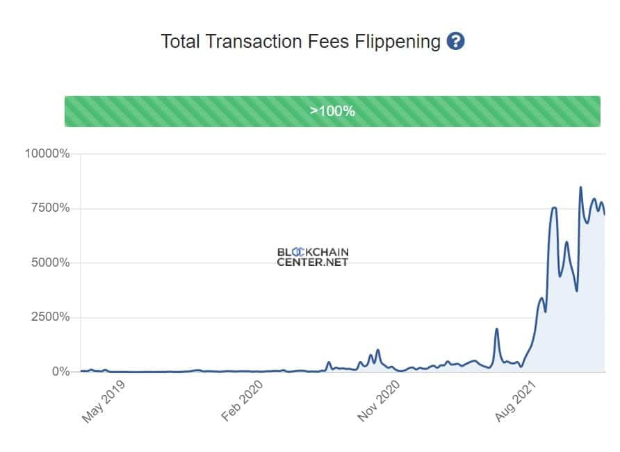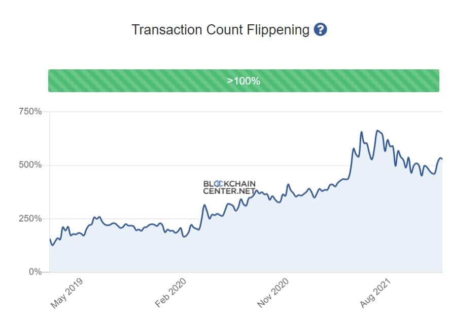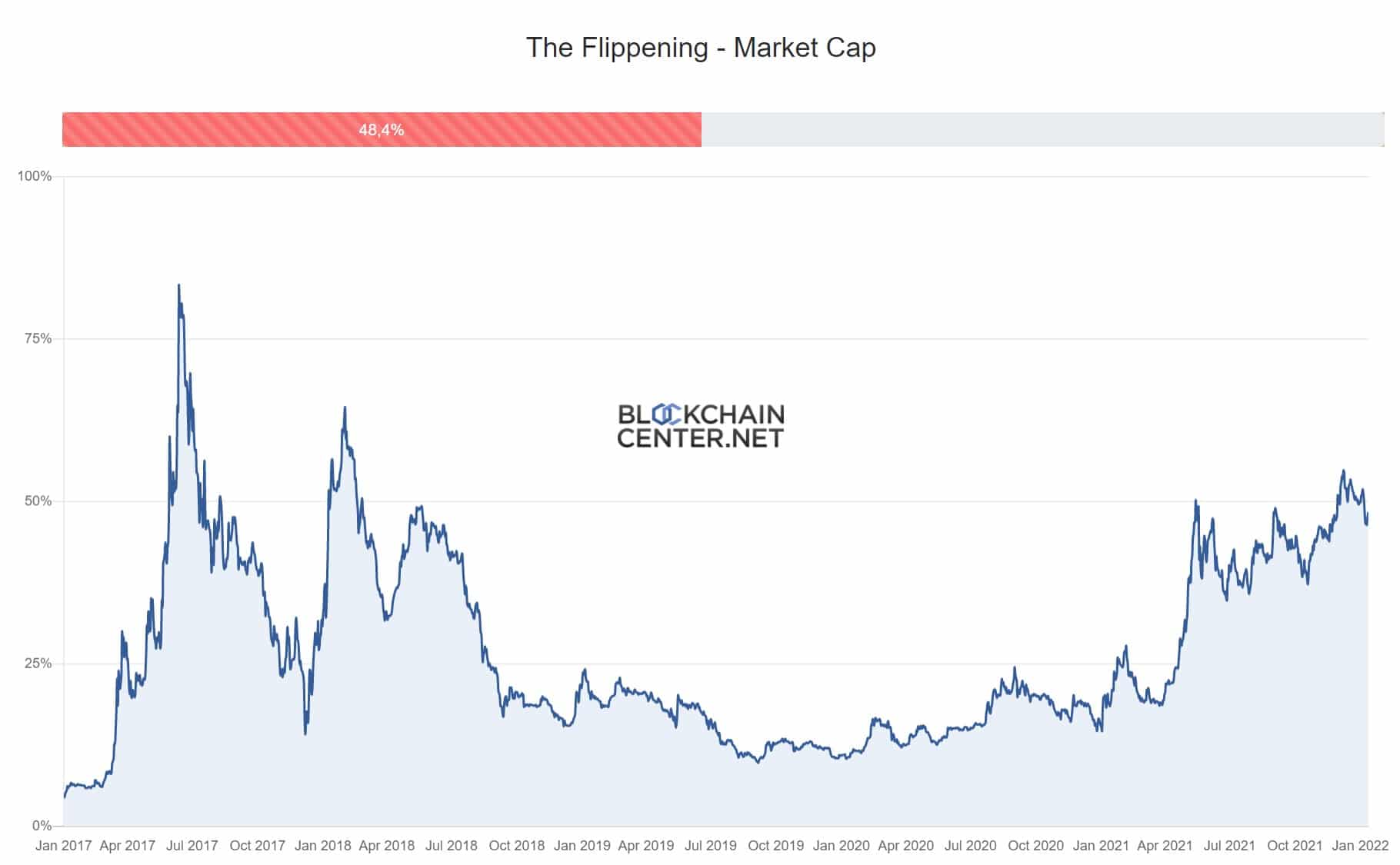 As of January 2022, Ethereum has a market cap of 48.4% the size of Bitcoin’s, just under halfway to having an equal market cap. A handy tool to view this metric and avoid having to do the math by hand can be found at blockchaincenter.net/flippening.