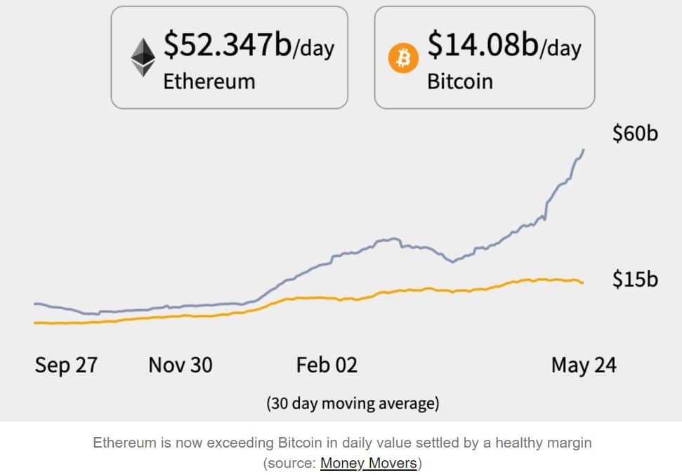 I am going to point out where Ethereum is already outpacing Bitcoin and argue why Ethereum stands a good chance at beating big daddy Bitcoin as the number one crypto. Ethereum has already flipped Bitcoin in on-chain transactions, value settled, and transaction fees generated.