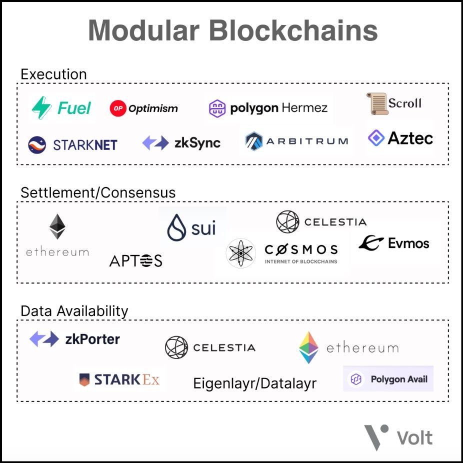 Today, we see the rise of modular blockchains specifically designed to optimize data availability for other blockchain networks. These modular blockchains, such as EigenLayer and Celestia, excel in providing high-speed data availability services. They offer actively validated services (AVS), ensuring that the data is stored efficiently and actively validated across the network. This allows other blockchains to offload their data availability needs to these specialized networks, improving overall performance and scalability.
