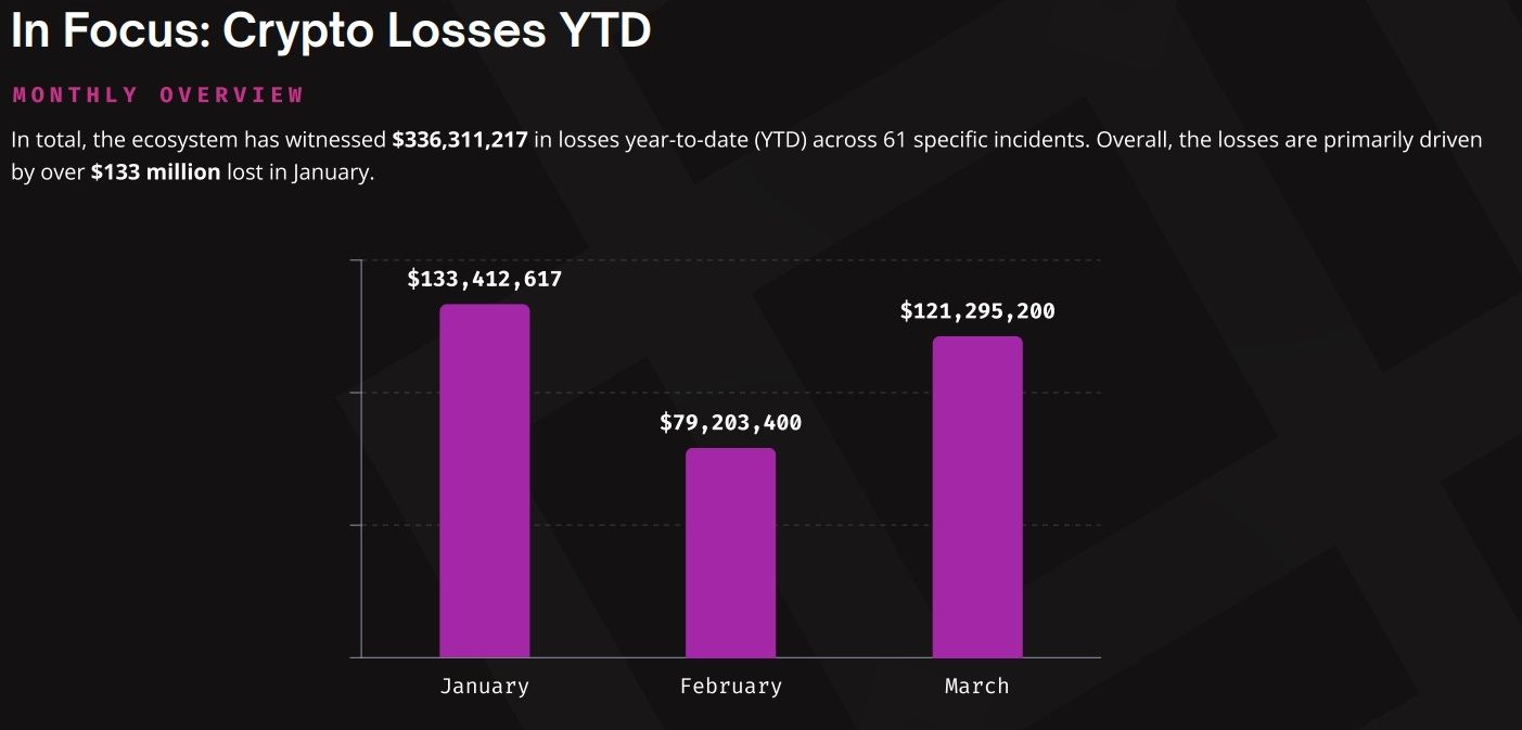 Bad Actors Have Devised Sophisticated Techniques to Target Blockchains. Image via ImmunefiAccording to Immunefi, the crypto industry lost $336.3 million in the first quarter of 2024. Of the total, $321.6 million was lost to hacks and $14.7 million was lost to fraud. By comparison, hackers and fraudsters stole $437.5 million in the first quarter of 2023.