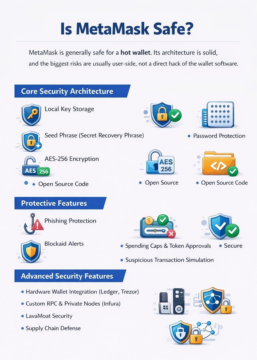 For a hot wallet, MetaMask is generally safe. Its basic architecture is credible, its code is transparent, and its security tooling has improved meaningfully over time. But the correct way to judge MetaMask is not to ask whether it is perfectly safe. No hot wallet is. The better question is whether its design is solid and whether the main risks are understood.