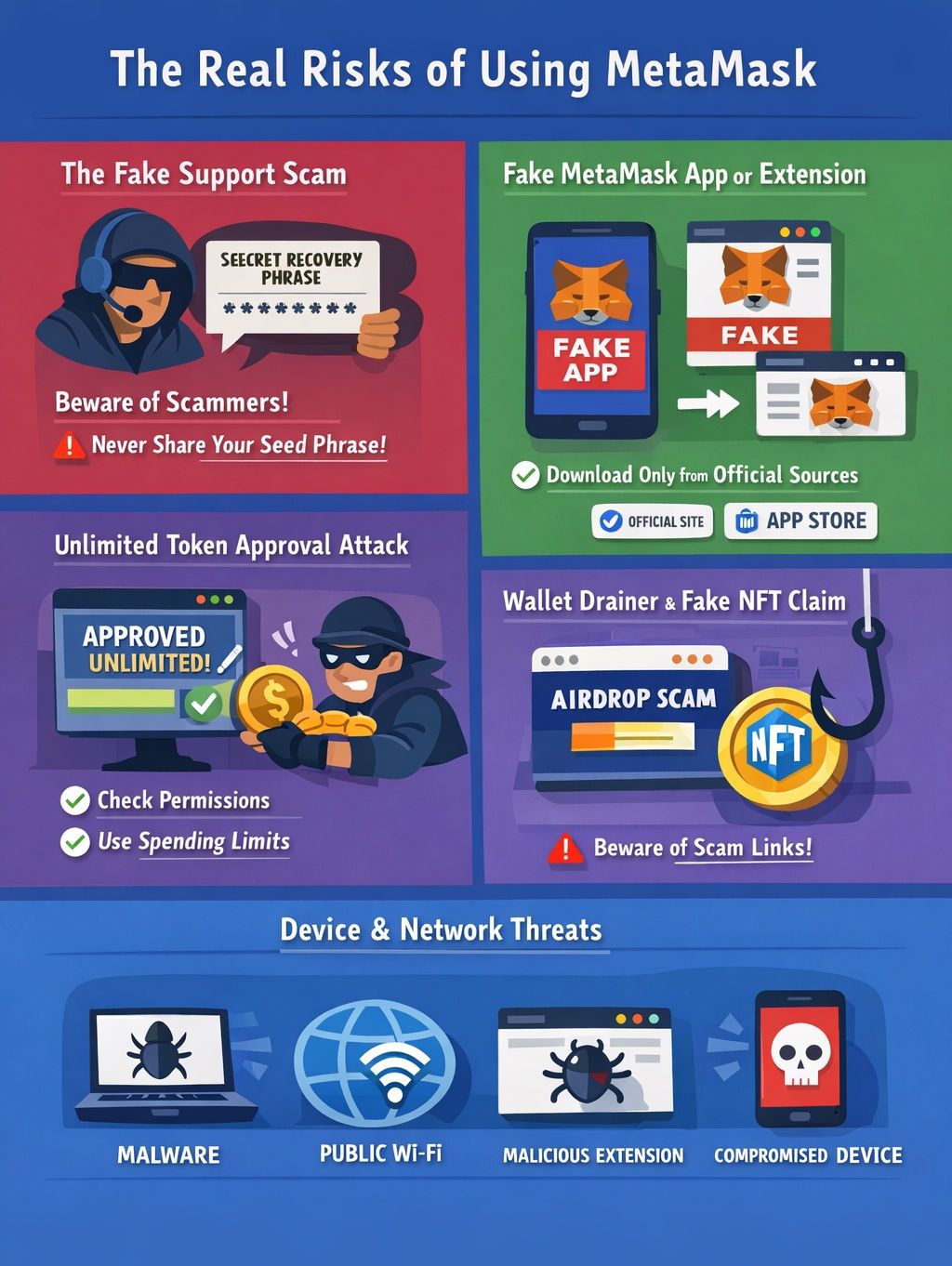 MetaMask is real, widely used, and generally safe when people use it properly. The main risks are not about the wallet suddenly failing or turning out to be illegitimate. They are the same risks that show up across crypto all the time: phishing, fake apps, malicious approvals, compromised devices, and too much exposure in active Web3 environments.