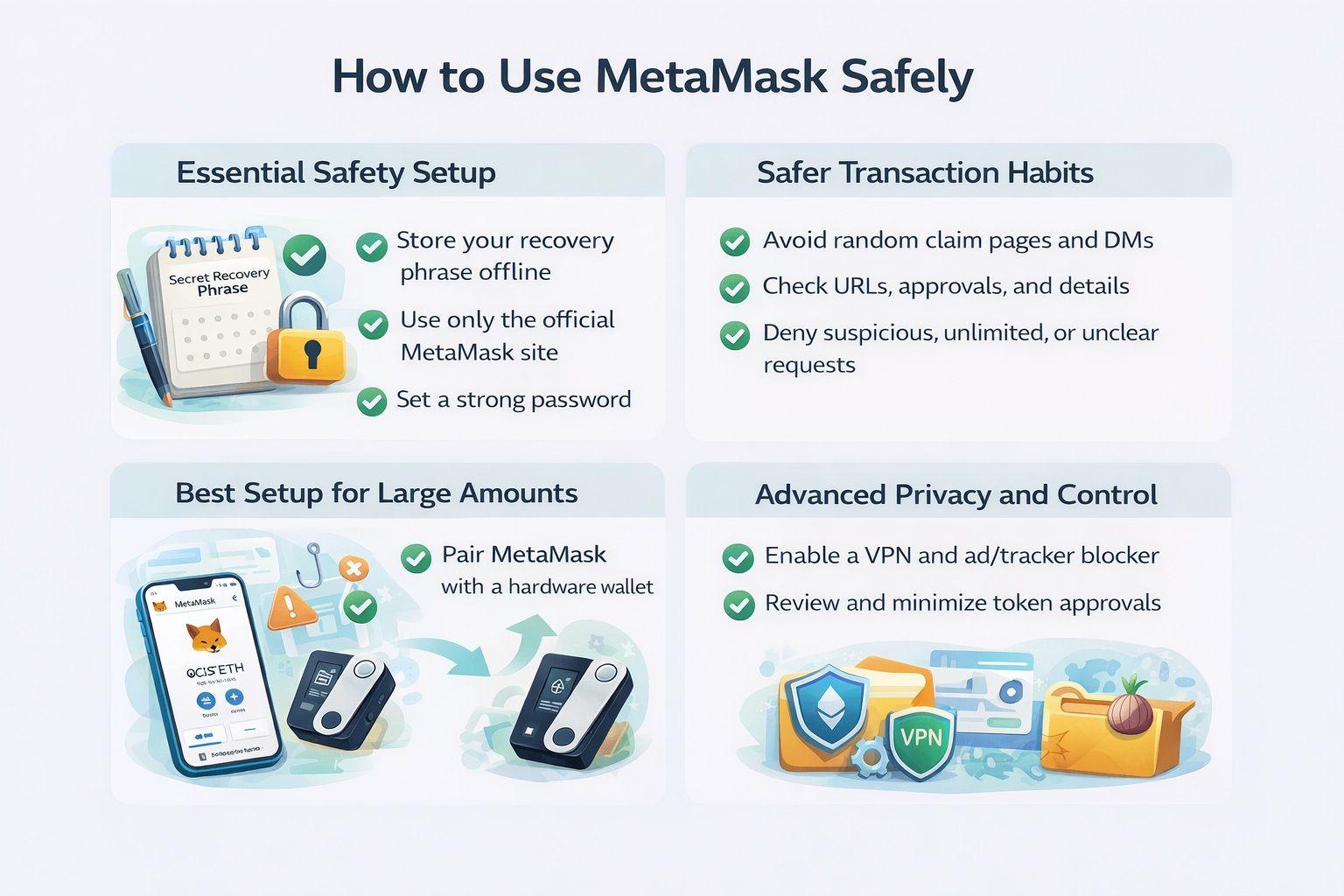 The good news is that safer MetaMask use does not require a full cybersecurity background. Most of it comes down to clean setup, slower signing habits, and separating storage from experimentation.