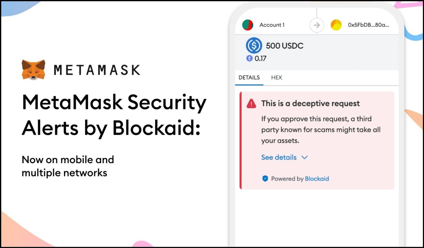 - MetaMask Security Alerts by Blockaid: MetaMask has partnered with Blockaid to provide an opt-in security alert feature. This feature warns users who unknowingly expose themselves to suspicious sites or authorizing transactions that could lead to scams or phishing attacks. The feature is available on several networks, including Ethereum, Linea, BNB Chain, Polygon, Arbitrum, Optimism, Avalanche, and Base.