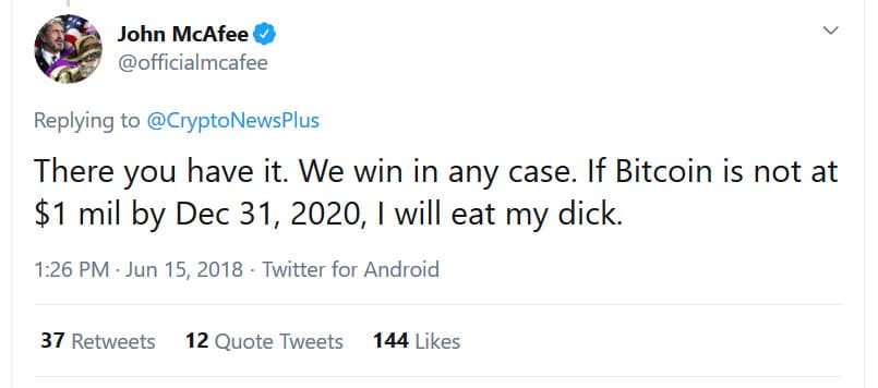 Take, for example, his bullish assertion in 2017 that Bitcoin would reach $500,000 by December 2020 and, if it didn’t, he would ‘eat my dick on national television.’ The following year he was at it again, this time predicting BTC to be at $1,000,000 instead. His dick is apparently still very much on the table, so to speak.