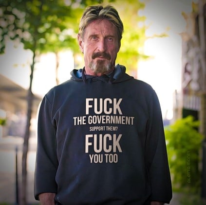 The outspoken type. Image via Twitter Despite inheriting his father’s fondness for booze, McAfee went on to study for a PhD in mathematics in Louisiana before being kicked out for sleeping with an undergraduate student. He learnt to code while drifting through various jobs, eventually ending up developing a system for routing trains while working for the Missouri Pacific Railroad. Whilst working there he also developed a fondness for LSD and other hallucinogens.