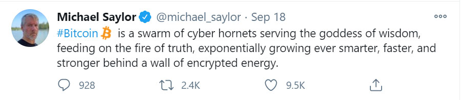 So… you’re saying I should buy some, right? Image via Twitter But it turns out that sparks flew when Michael Saylor and bitcoin came together, despite his initial prediction that nothing would come of it. In the last few years Saylor has become one of bitcoin’s greatest apostles, spreading the word far and wide and likening it to ‘a battery charged with monetary energy’ and ‘a chain reaction spreading like a fire in cyberspace.’ In a good way, that is.
