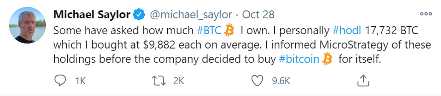 Saylor reportedly owns 17,732 bitcoins personally, bought at an average of $9,882 – a position which convinced his company to get involved as well. His Twitter feed is a non-stop parade of bitcoin-positive opinions and soundbites, while YouTube is well-stocked with videos of him singing its praises. One is left with the impression that, even if he’s only half right, this current bull run we’re enjoying is merely the tip of one almighty iceberg. Again, in a good way.