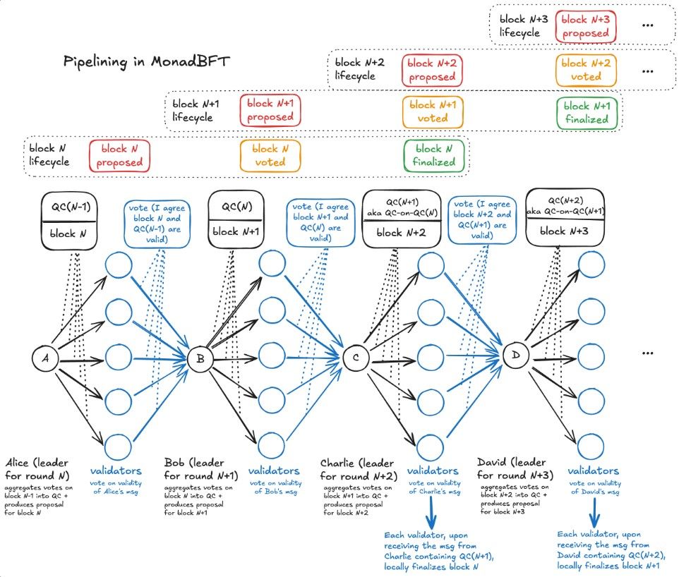 - MonadBFT – A custom BFT consensus optimized from HotStuff with pipelined rounds and speculative single-round finality.