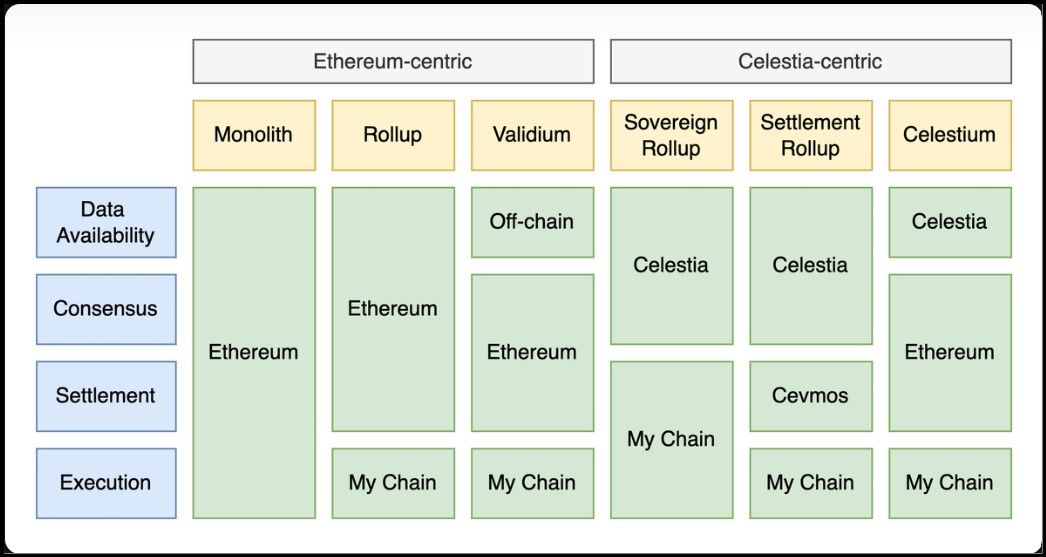 The exploration of modularity designs such as Execution rollups, Validium, and Sovereign rollups demonstrates the innovative ways in which blockchain architecture is evolving to meet diverse needs. Each design offers unique benefits and trade-offs, highlighting the potential for tailored blockchain solutions that optimize scalability, autonomy, and efficiency across various applications and platforms. The following diagram sums up the various designs we explore today.