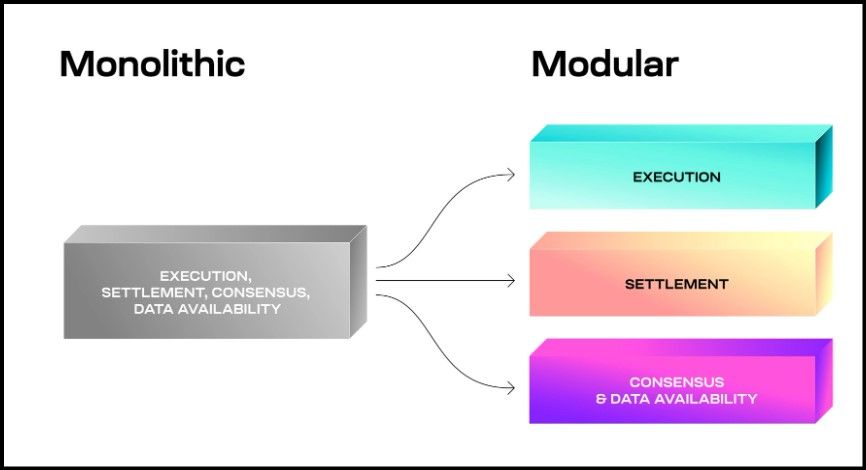 - Evolutionary Design: Unlike monolithic blockchains that consolidate all processes within a single layer, modular blockchains separate these processes into distinct layers or modules. This segregation allows each module to specialize and optimize for its specific function, whether it be data availability (DA), consensus, settlement, or execution.