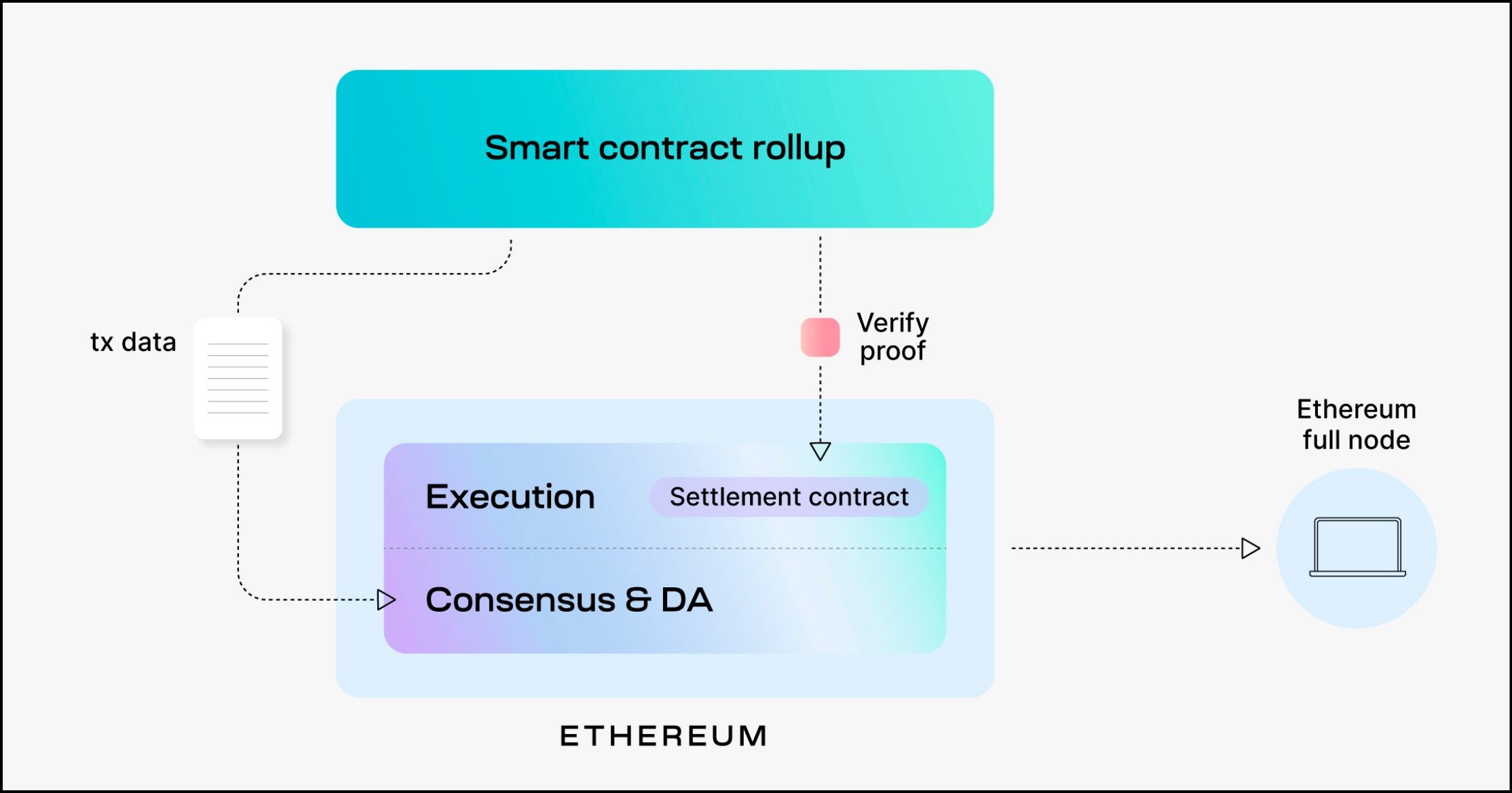 - Consensus: Incorporating the updated rollup state into the Ethereum blocks as part of the global Ethereum state.