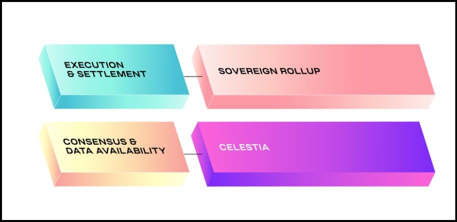 Sovereign Rollup Design | Image via Celestia- Modular Design: A Sovereign rollup has separate settlement and execution layers, with the parent chain providing only DA services and consensus.