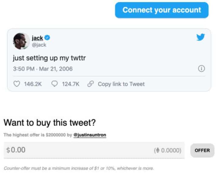 If the Beeple collage and CryptoPunks sagas haven’t awakened your sense of the surreal, then perhaps this next NFT will. Jack Dorsey, the luxuriantly-bearded founder of Twitter, is currently in the process of auctioning off his first-ever tweet as an NFT. And the winning bid so far stands at $2.5 million with five days left to go. Yes, once again, you did read that right.