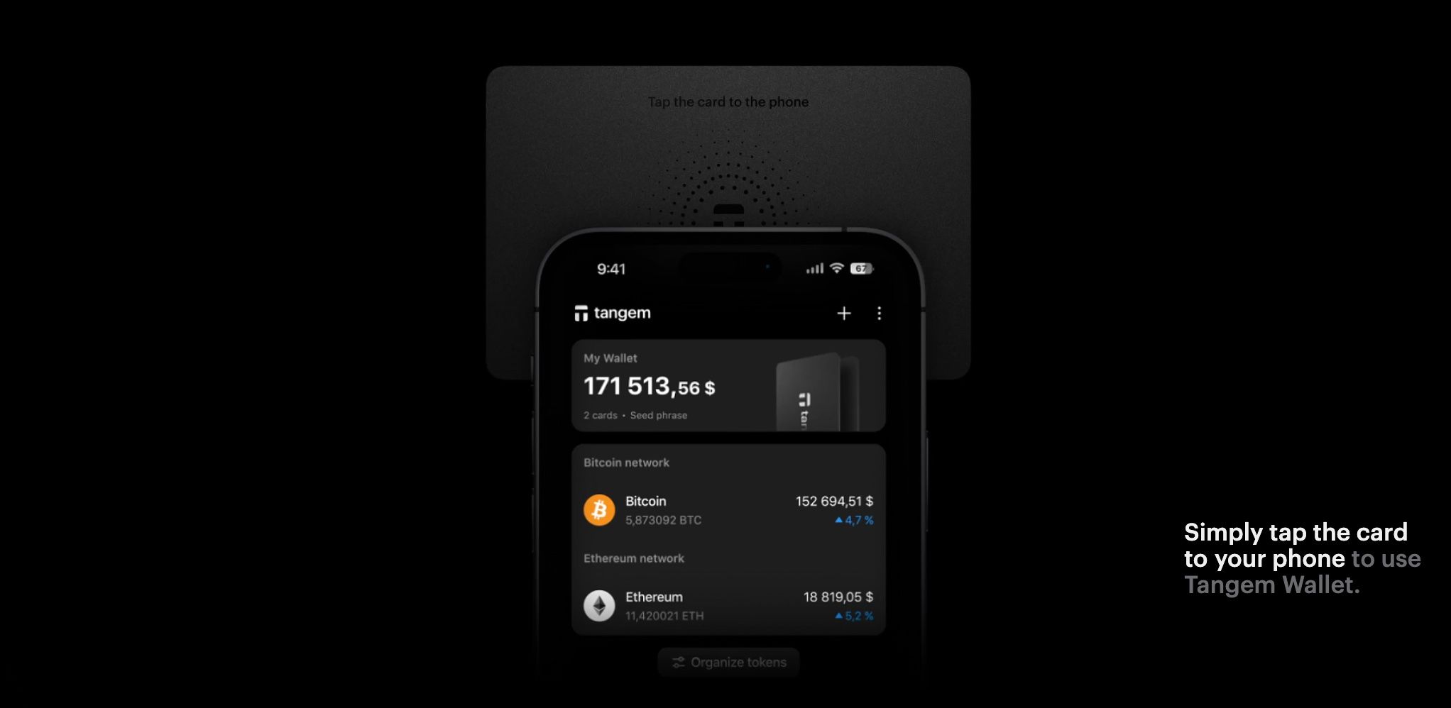 | Tangem | Hardware (NFC Card) | Seedless, EAL6+ chip, tamper-proof smartcard | Biometric via phone + card tap | Yes | via App + WalletConnect | Mobile | $54.9+ (set of 2-3 cards) |