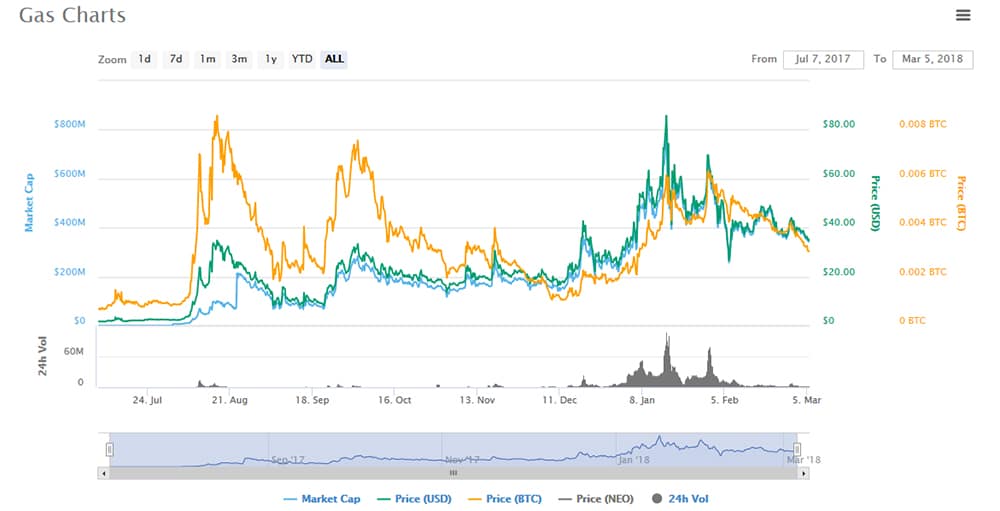 Gas Prices. Source: coinmarketprice.comToday, GAS is trading for just about $35 each and has a market cap of just under $350 million independent of Neo. In the past, prices have ranged from between $2.50 to over $80.