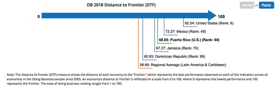 Image Source.For Distance to the Frontier (which represents the best performance observed on each of the indicators across all economies in the Doing Business sample since 2005) Puerto Rico has a score of 68.85, putting it 10 points above the regional average (Latin America & Caribbean)