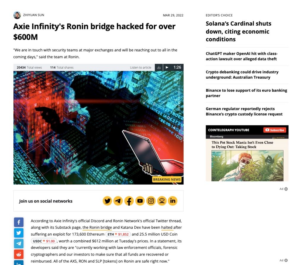 Image via CoinTelegraphOn March 23, 2022, the crypto community witnessed the biggest breach in crypto history involving the exploitation of the Ronin bridge, resulting in a staggering sum of approximately $612 million. This amount included 173,600 ETH and 25.5 million USD Coin (USDC).