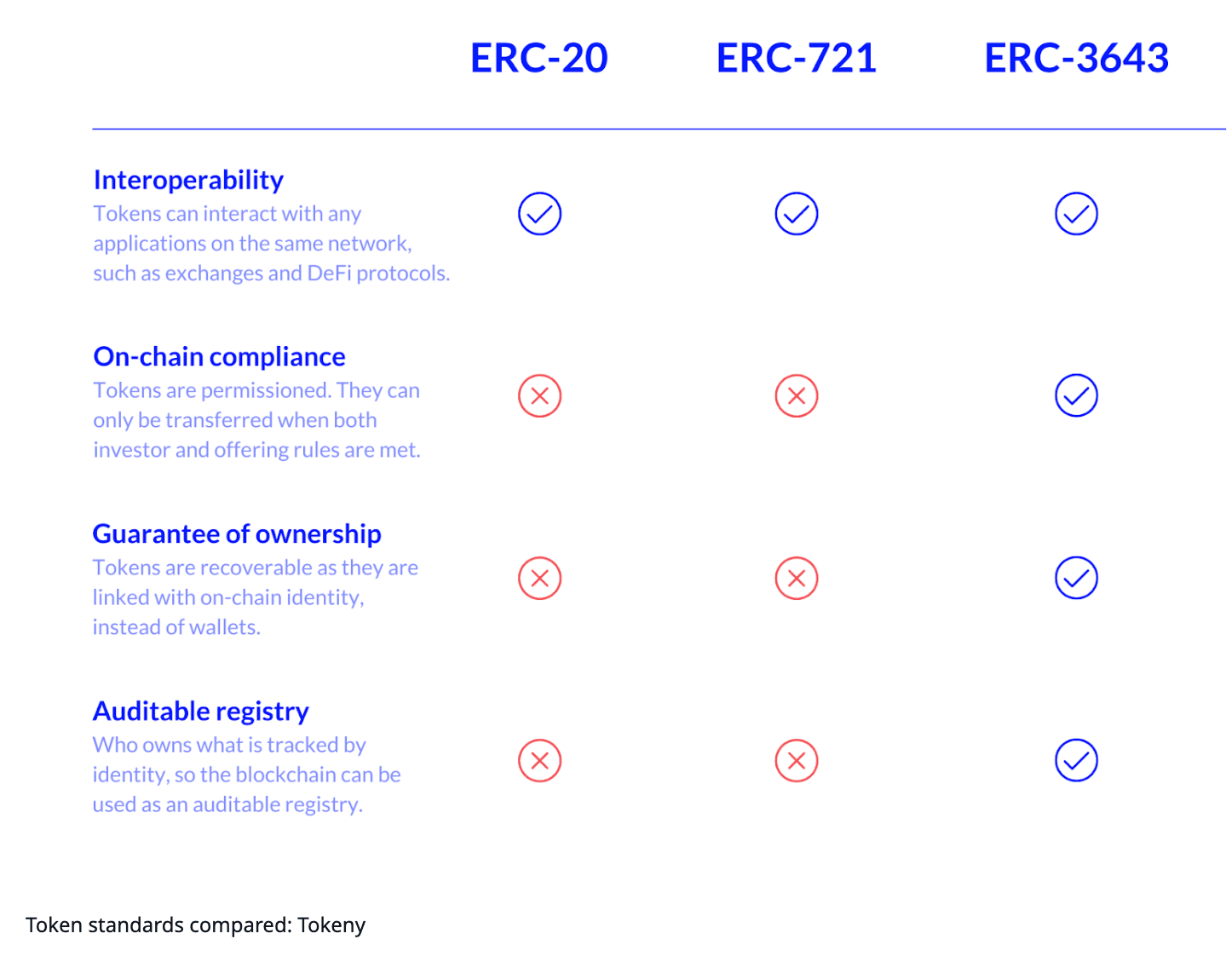 How ERC3643 works. Image via TokenyHere is a brief comparison of ERC3643 with the other token standards for your reference: