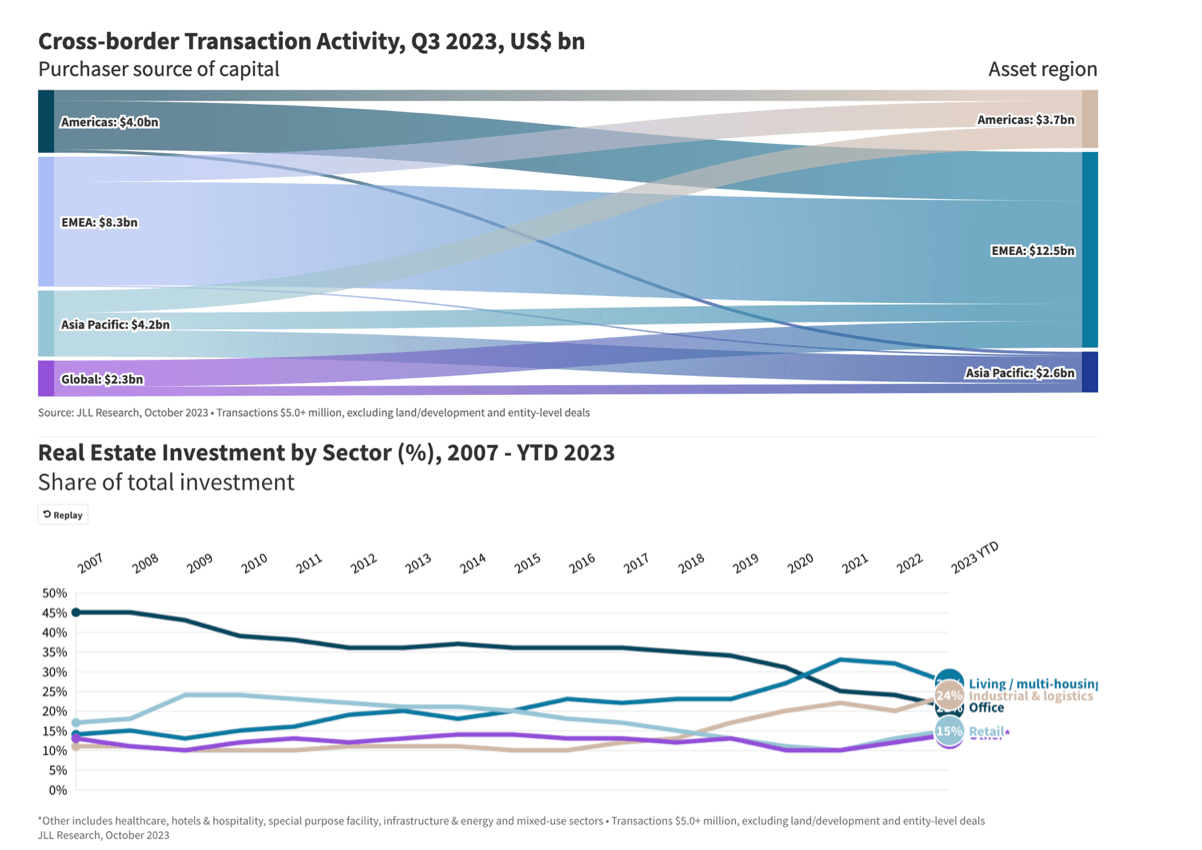As of 2021, the global real estate market was worth about $3.69 trillion. Between 2022 and 2030, it's expected to grow at a compounded annual rate of 5.2%, according to a report issued by Grandview Research, a marketing and consultancy company based in the US. Jones Lang and LaSalle, commonly known as JLL, also issued a report stating that cross-border transactional activity in real estate was around $18.8 billion as of Q3 2023, with the majority in the EMEA region. The lion's share, 27% of it, is in worldwide residential property followed closely by industrial/logistics at 24%.