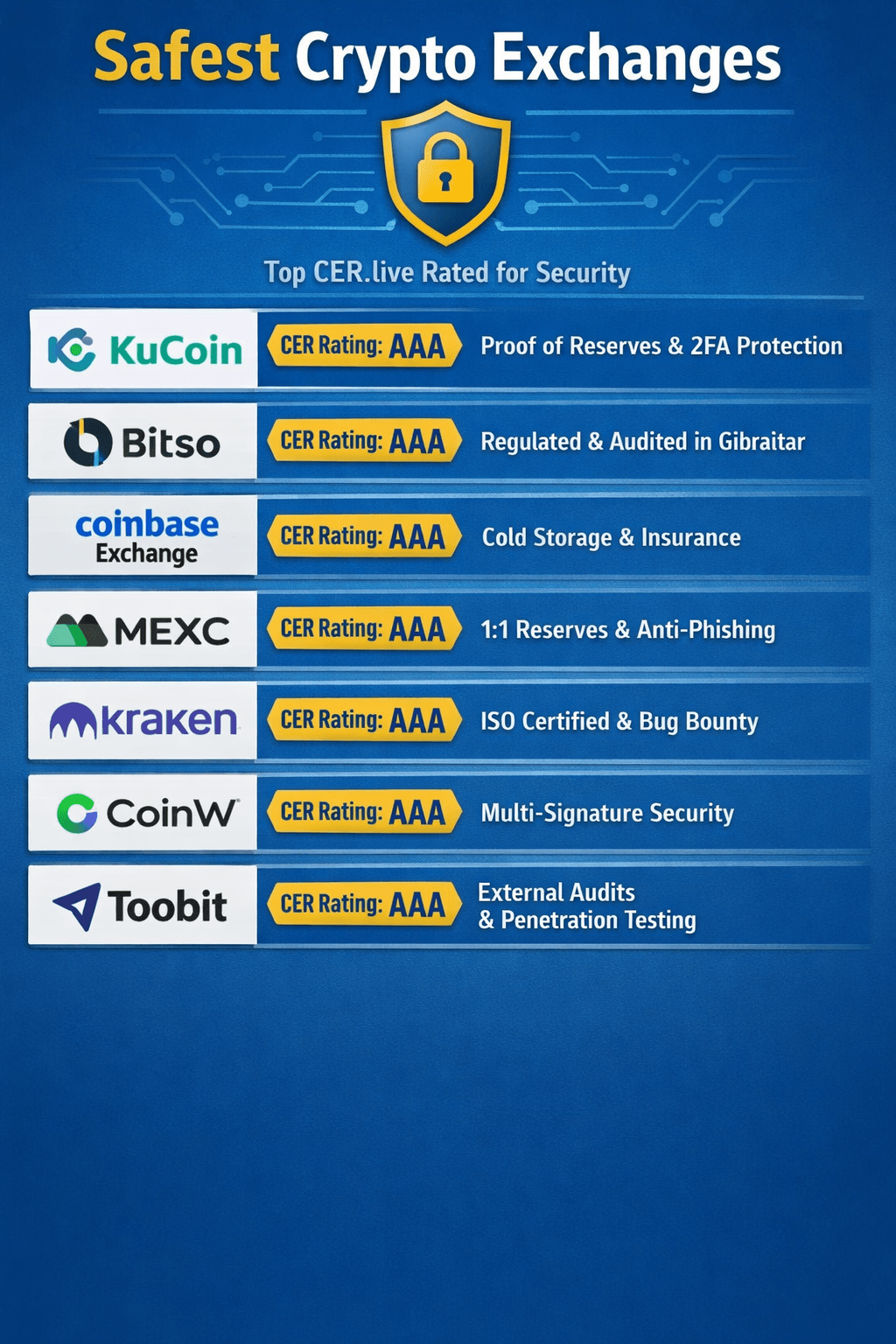 Based on CER.live’s security ratings, Kraken KuCoin, MEXC, Bitso, CoinW, Toobit and Coinbase are the cleanest picks for regulation + battle-tested ops. If you want the safest “default” path, prioritize exchanges with independent security attestations (e.g., ISO/SOC), user-verifiable Proof of Reserves, and strong account controls (2FA, anti-phishing, withdrawal protections).