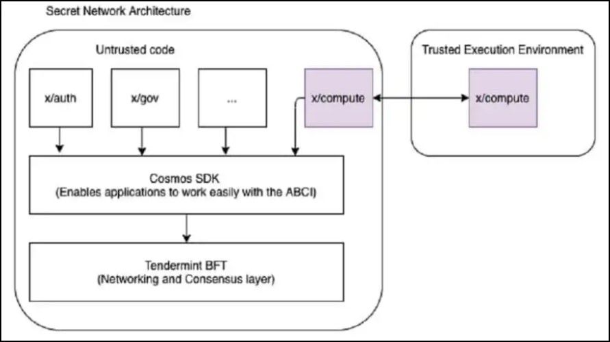 Secret Network runs on a trustless component and a trusted component. The trustless component is Tendermint which defines its core operations like networking and consensus. The trusted component comprises enclaves, which are a trusted execution environment for the private processing of smart contracts. Enclaves work by executing smart contracts and sending the encrypted data to Tendermint for consensus.