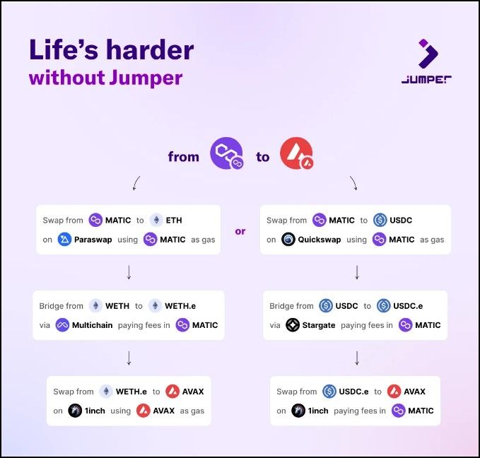 Jumper Exchange Blog illustrates the complications of cross-chain swapsThe picture above illustrates how complicated it can get to swap MATIC (now POL) tokens to AVAX. The Jumper Exchange pushes all such convoluted steps behind the curtain and presents a clean interface to the user.