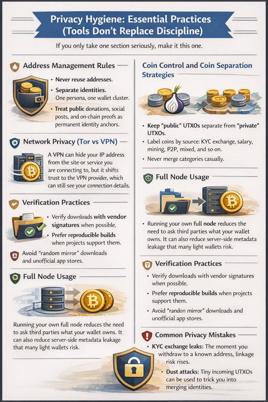- Wallets alone don’t guarantee anonymity: Privacy comes from coin control, node choice, routing, and how you transact.
