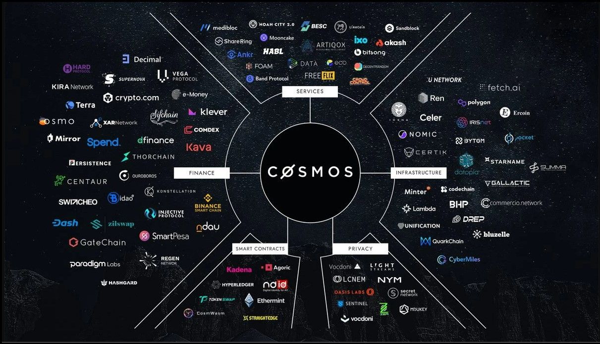 Cosmos is an ambitious project aiming to become the "Internet of Blockchains" by creating an interoperable ecosystem of connected blockchains. It utilizes the Tendermint Byzantine Fault Tolerant algorithm for consensus and the Inter-Blockchain Communication (IBC) protocol for seamless token transfers between blockchains.