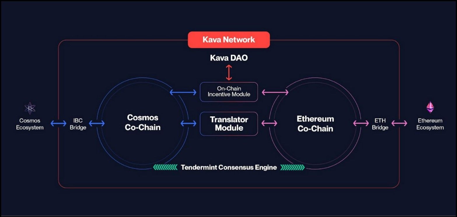 Kava Architecture | Image via Kava DocsThe Kava network comprises two chains: The Cosmos Co-Chain and the Ethereum Co-Chain. The Ethereum Co-Chain is EVM compatible, therefore Ethereum-DApps can easily deploy in the Kava ecosystem and enables Solidity developers to leverage the Kava network’s interoperability, composability and scalability.