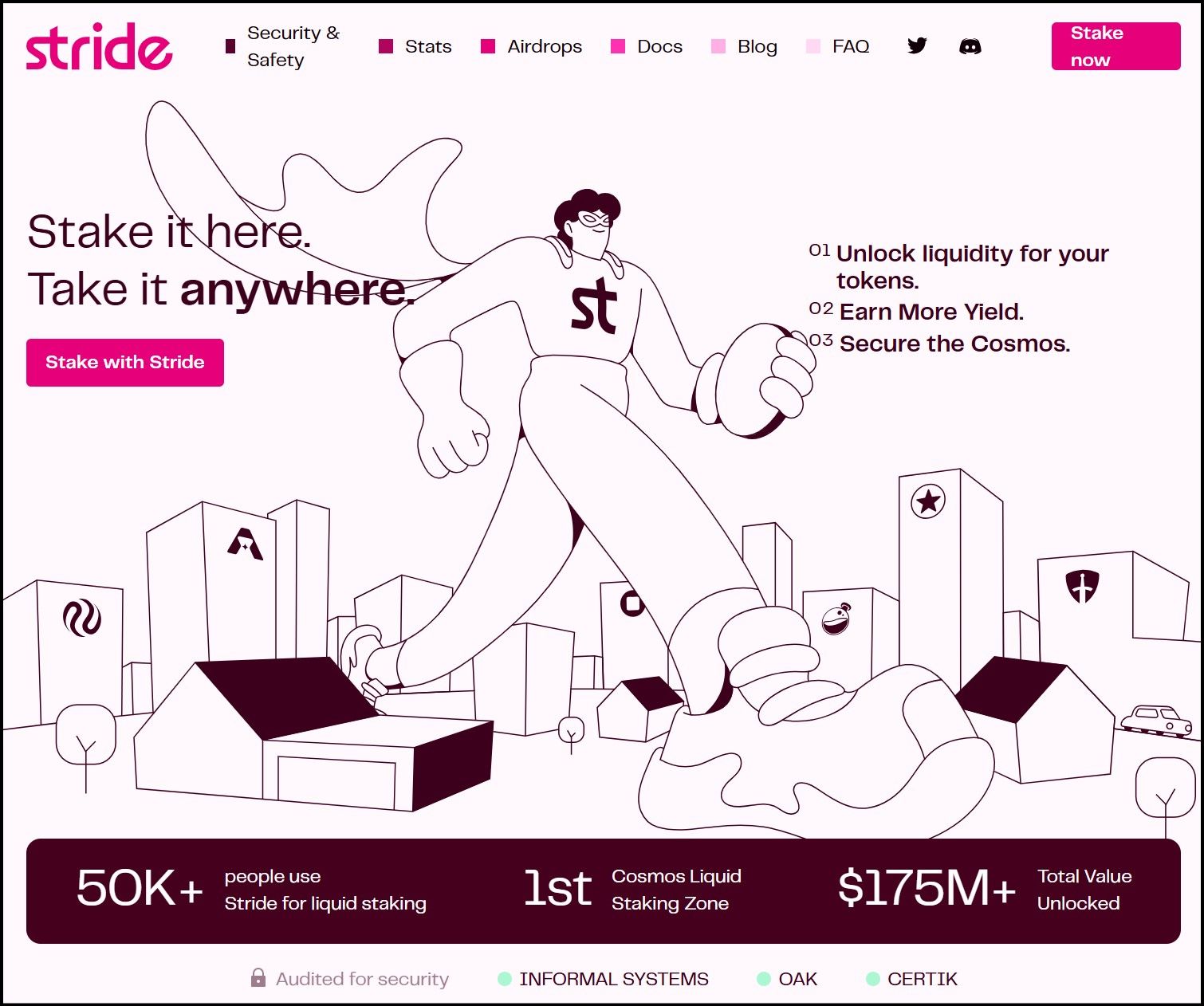 Stride supports liquid staking for the Cosmos Hub token (stATOM), Osmosis (stOSMO), Celestia (stTIA), dYdX (stDYDX), Injective (stINJ), Stargaze (stSTARS), Evmos (stEVMOS), Terra (stLUNA), Umee (stUMEE), Juno (stJUNO), Comdex (stCMDX) and Sommelier (stSOMM), making Stride the liquid staking hub of the Cosmos eosystem.