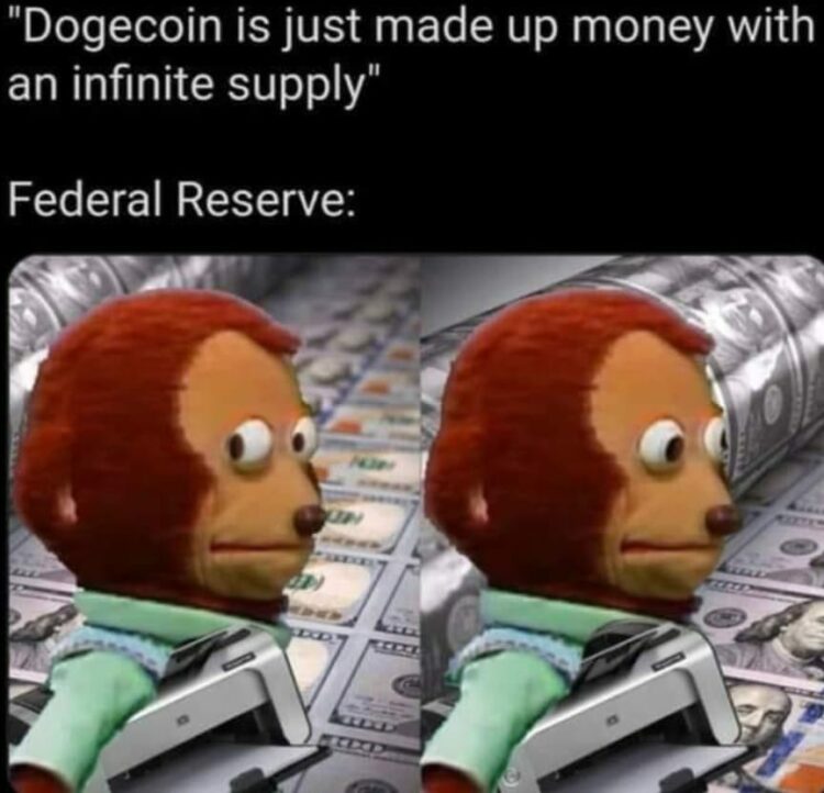 The meme highlighting the issue that if the Fed can just continue to print money, why is an infinite supply of Doge a problem but printing an infinite supply of money isn’t?