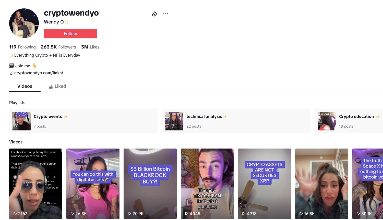 Image via Tiktok.com/@cryptowendyoShe’s also active on various other platforms, including Instagram but TikTok seems to be the place where CryptoWendyO has found her spiritual home. She covers a wide range of crypto projects, with recent videos on XRP, ADA vs DOT, Litecoin and Dogecoin as well as BTC and ETH. Her videos are informative, to-the-point and regular as clockwork.