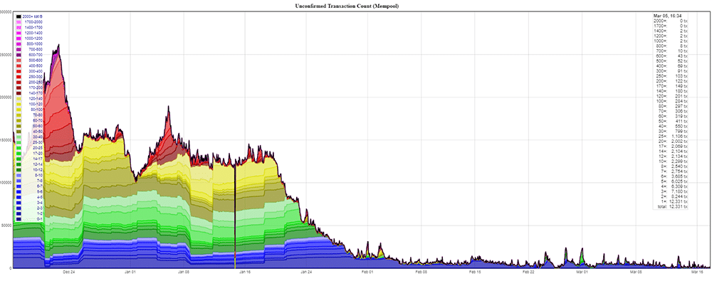 The Bitcoin Memepool over timeAs you can see, the size of the Bitcoin memepool (uncomfirmed transactions) has been decreasing steadily since November of last year. This could be down to a number of factors including further SegWit adoption as well as new innovations such as the lightning network.