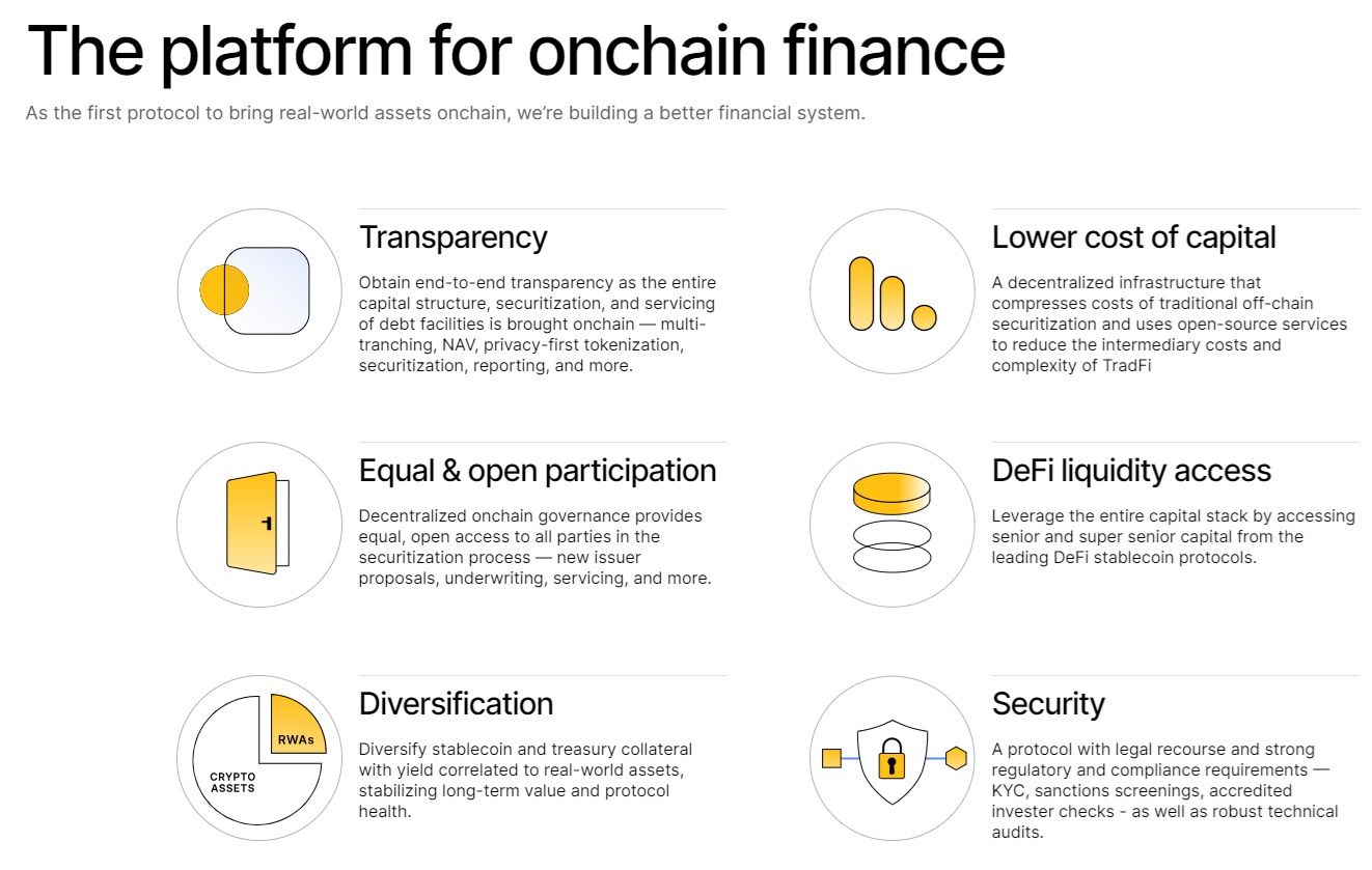 Centrifuge Is A Platform For Tokenizing, Managing And Investing In A Portfolio of RWAs. Image via CentrifugeThe platform offers comprehensive infrastructure and ecosystem support for tokenizing, managing, and investing in a diverse array of real-world assets. These asset pools are fully collateralized, ensuring investor protection and legal recourse. Centrifuge's protocol is agnostic to asset class, spanning structured credit, real estate, US treasuries, carbon credits, consumer finance and more.